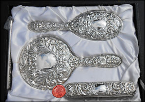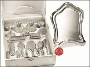 Set Bellezza: Uno specchio bordato in Argento, una spazzola, un pennello cipria, 4 boccette