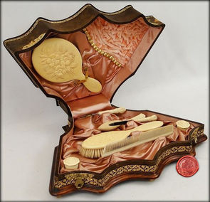 Set Bellezza valigetta in pelle foderata in seta con 1 specchio in avorio, 1 spazzola in avorio. 1 pettine in avorio, 3 attrezzi e 2 scatoline in avorio.